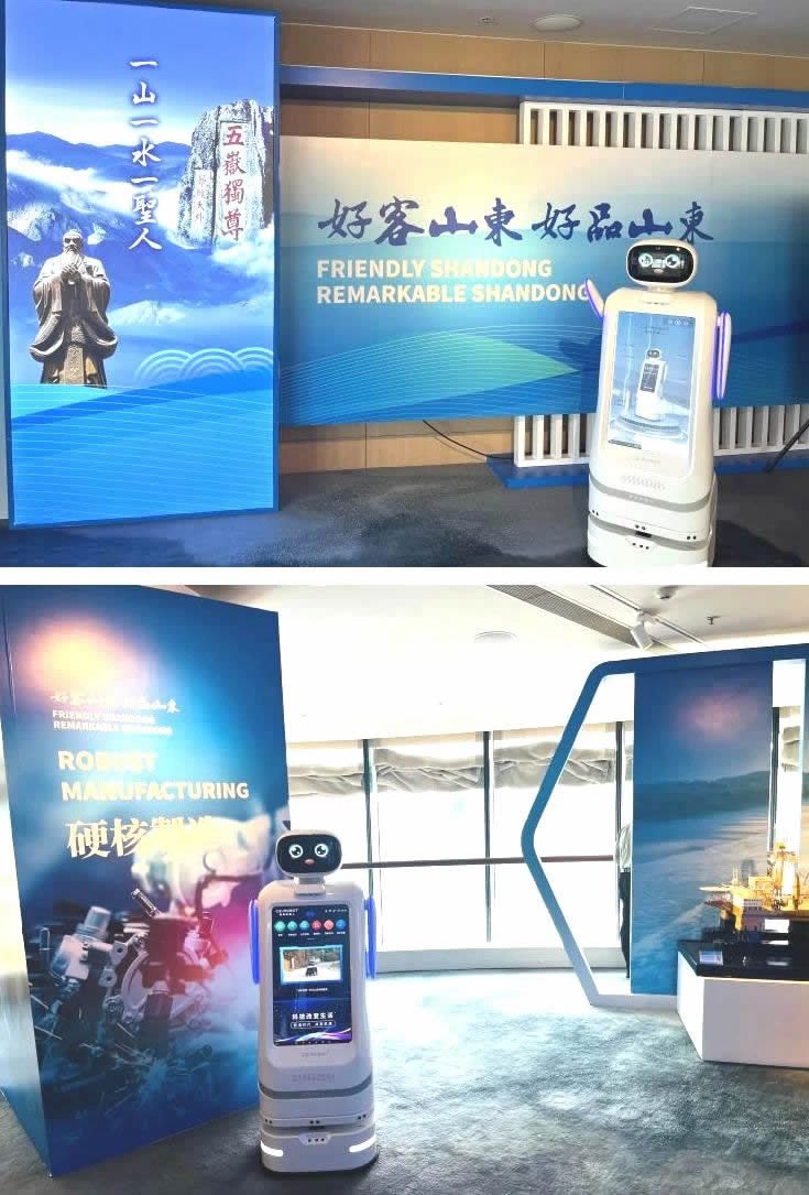 5月27日下午,在“好客山東 好品山東”展區(qū),類(lèi)人型智能服務(wù)機(jī)器人“創(chuàng)創(chuàng)”作為主題墻1號(hào)展品熱情迎接了全國(guó)政協(xié)副主席梁振英、省委書(shū)記林武等與會(huì)L導(dǎo)和嘉賓。