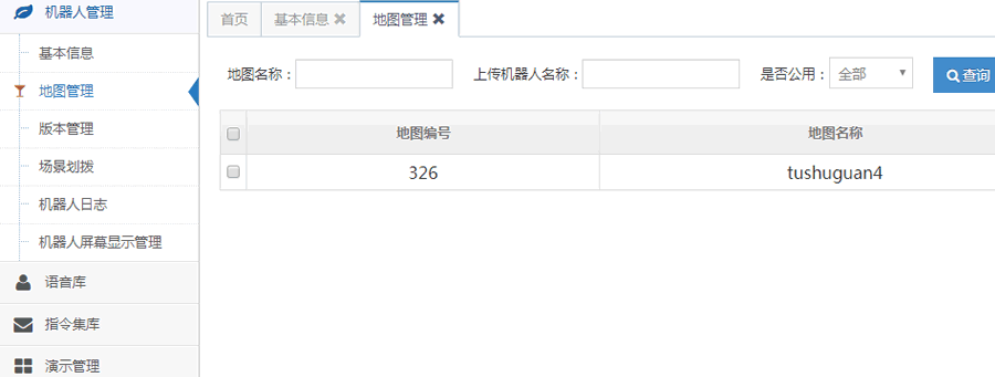 地圖管理模塊是對機器人地圖庫及對應(yīng)地圖和記錄點的查看,包括地圖名稱,對應(yīng)的機器人名稱和更新時間等內(nèi)容。